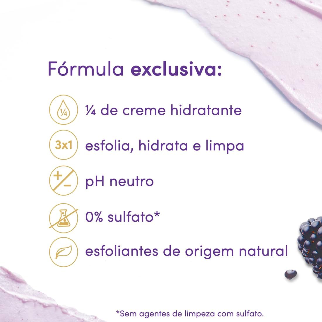 Esse esfoliante de Amora e Frutas Cítricas da Dove conta com ¼ de creme hidratante, que hidrata a pele enquanto remove células mortas, promovendo uma hidratação instantânea e duradoura