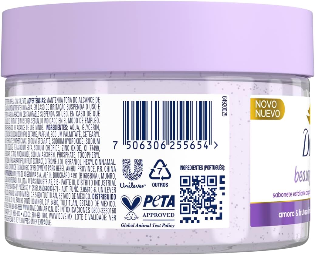 Para obter uma pele macia e radiante, a esfoliação adequada deve ser parte essencial da sua rotina de cuidados com a pele. Por isso, a Dove desenvolveu a linha Dove Beauty Scrub, para oferecer esfoliação suave e uma experiência sensorial única. O Sabonete Esfoliante Corporal Dove Amora e Frutas Cítricas, feito com ¼ de creme hidratante, remove células mortas e impurezas, restaurando os nutrientes da pele enquanto esfolia suavemente.Com uma textura fácil de espalhar, esse esfoliante corporal Dove proporciona uma experiência de cuidado com no banho, deixando a pele suave e hidratada ao mesmo tempo em que oferece um aroma de Amora e Frutas Cítricas. Ele é ideal para quem deseja uma pele renovada, com um toque aveludado e aparência aveludada.Formulado com partículas esfoliantes de origem natural e sem sulfato, esse produto não danifica a barreira de proteção da pele, oferecendo uma esfoliação para pele sensível e ressecada, promovendo a renovação da pele sem causar danos.Dove é Cruelty-Free pela PETA e não realiza testes em animais.