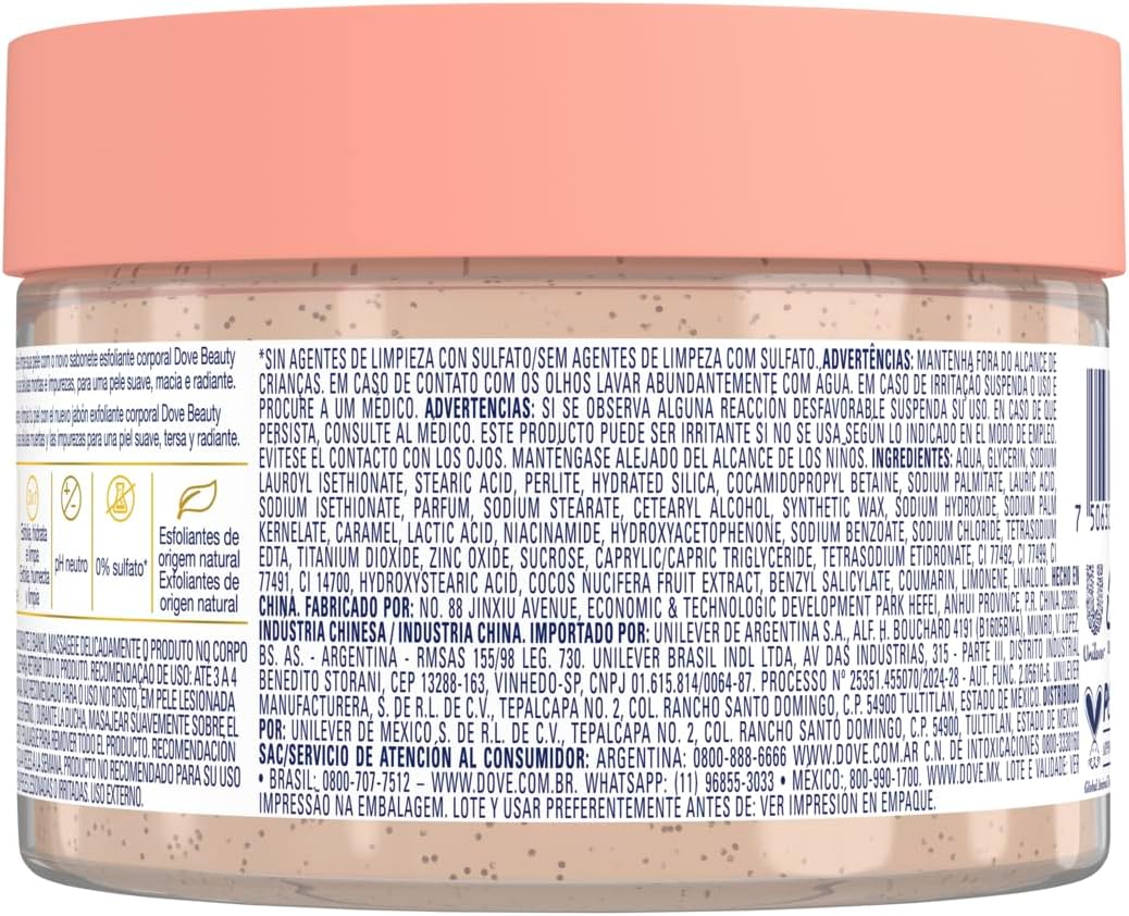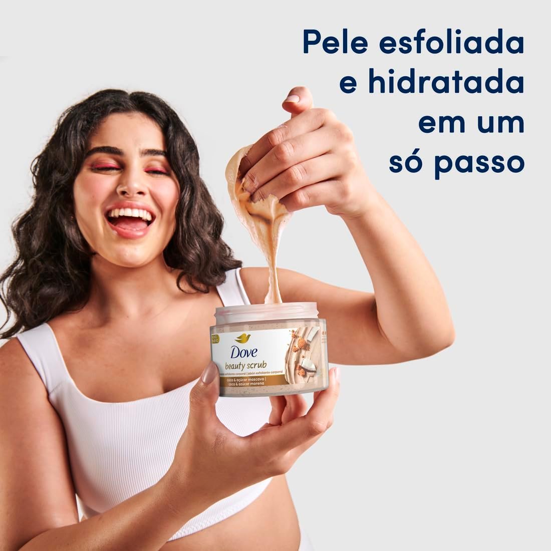 O Dove Beauty Scrub Coco e Açúcar Mascavo é um esfoliante corporal formulado com partículas esfoliantes de origem natural que proporcionam uma esfoliação moderada, deixando a pele com um toque macio e visivelmente aveludada