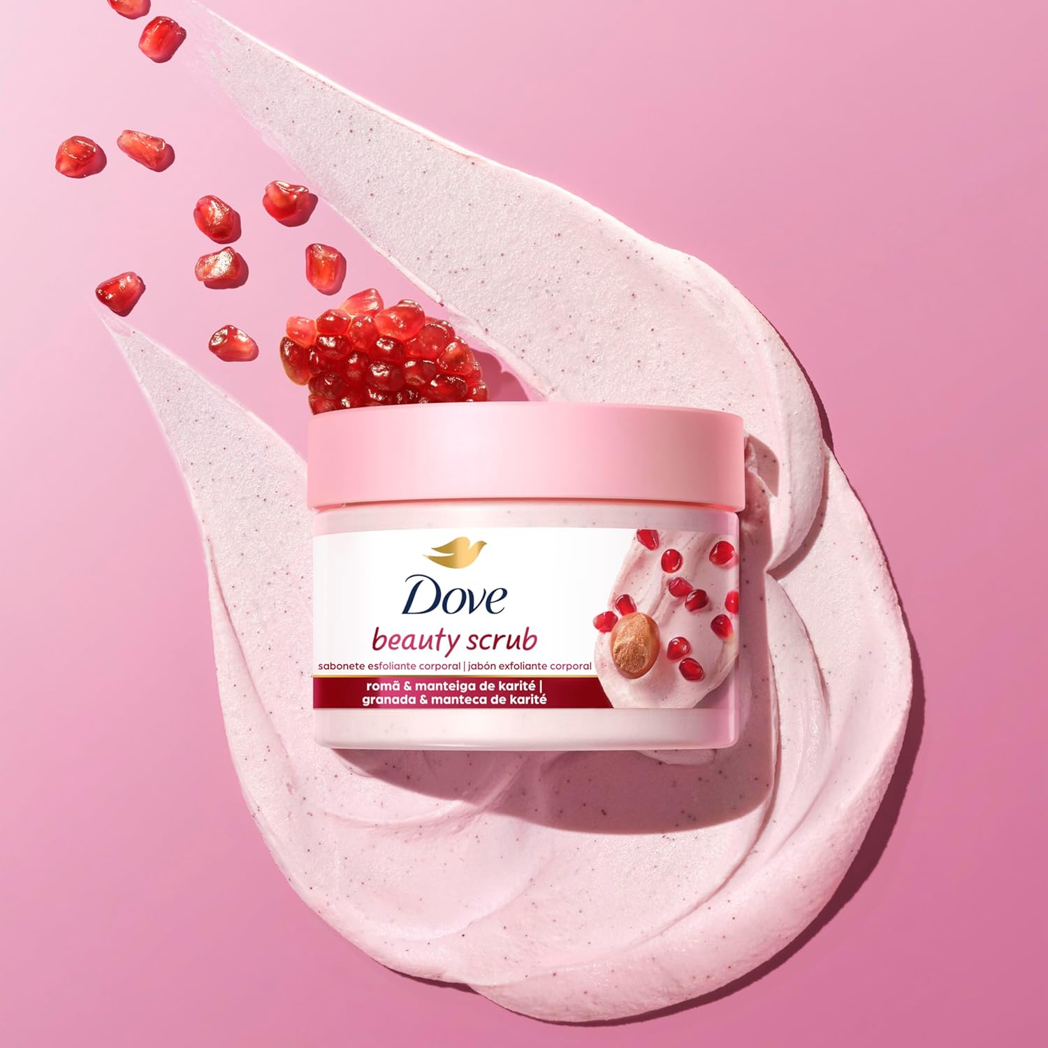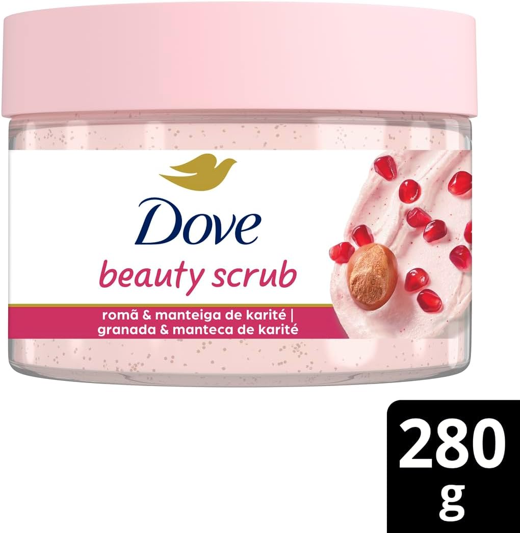 O Dove Beauty Scrub Romã e Manteiga de Karité é um esfoliante corporal formulado com partículas esfoliantes de origem natural que proporcionam uma esfoliação moderada, deixando a pele com um toque macio e visivelmente aveludada