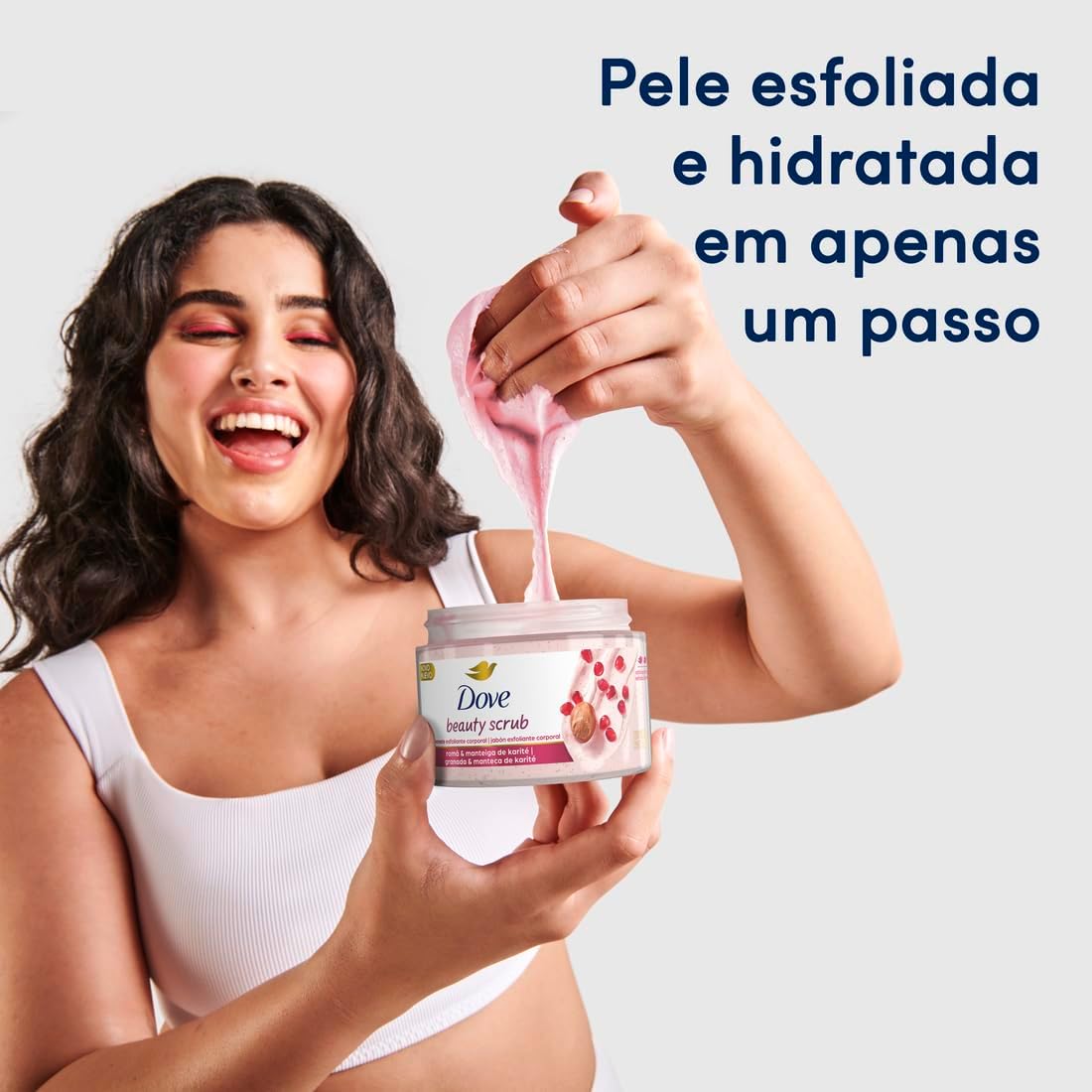 Esse esfoliante de romã e manteiga de karité da Dove conta com ¼ de creme hidratante, que hidrata a pele enquanto remove células mortas, promovendo uma hidratação instantânea e duradoura