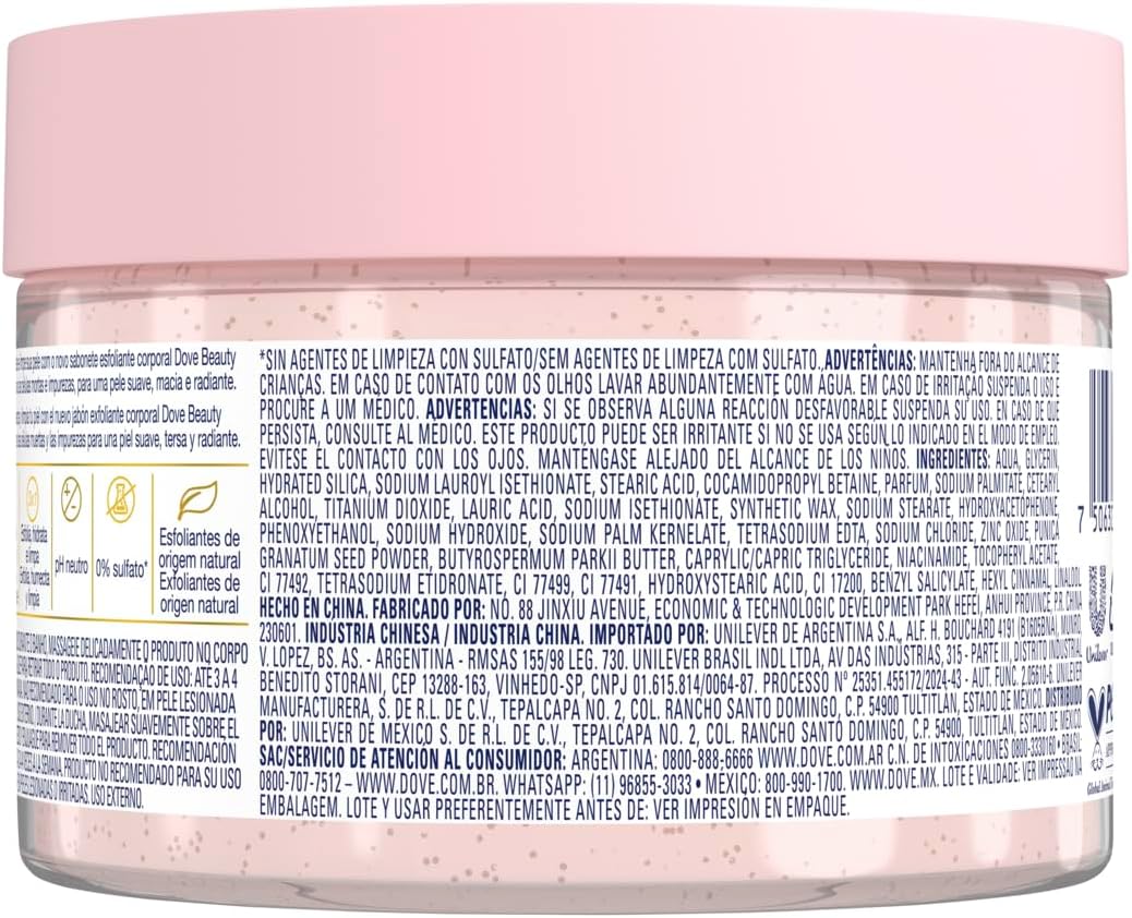 Para obter uma pele macia e radiante, a esfoliação adequada deve ser parte essencial da sua rotina de cuidados com a pele. Por isso, a Dove desenvolveu a linha Dove Beauty Scrub, para oferecer esfoliação suave e uma experiência sensorial única. O Sabonete Esfoliante Corporal Dove Romã & Manteiga de Karité, feito com ¼ de creme hidratante, remove células mortas e impurezas, restaurando os nutrientes da pele enquanto esfolia suavemente.Com uma textura fácil de espalhar, esse esfoliante corporal Dove proporciona uma experiência de cuidado com no banho, deixando a pele suave e hidratada ao mesmo tempo em que oferece um aroma frutado de romã. Ele é ideal para quem deseja uma pele renovada, com um toque aveludado e aparência aveludada.Formulado com partículas esfoliantes de origem natural e sem sulfato, esse produto não danifica a barreira de proteção da pele, oferecendo uma esfoliação para pele sensível e ressecada, promovendo a renovação da pele sem causar danos. Manteiga de karité ajuda a deixar a pele mais suave e radiante, proporcionando cuidados de beleza essenciais durante o banho.Dove é Cruelty-Free pela PETA e não realiza testes em animais.
