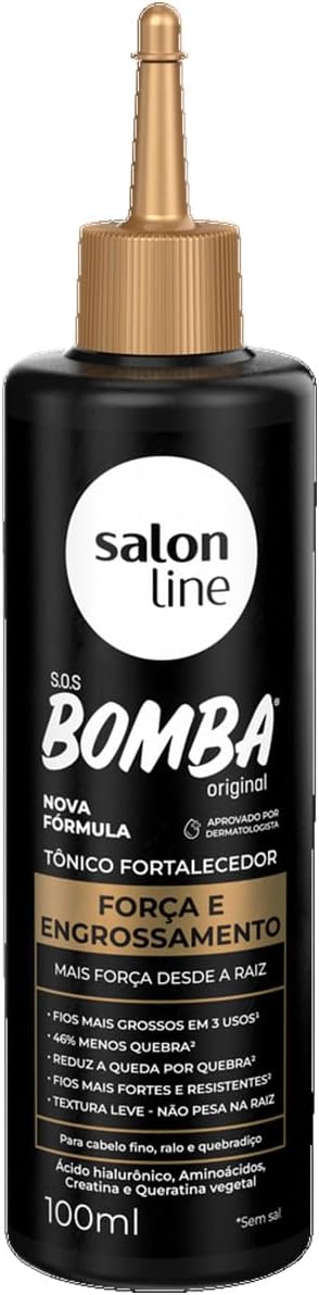 Fortalecimento com menos quebra! O Tônico Capilar S.O.S Bomba Força e Engrossamento é um aliado direto na busca por fios mais grossos, cabelos encorpados, resistentes e com menos quebra. Garantindo eficiência comprovada de 89% menos quebra dos fios de acordo com testes realizados em laboratório independente, o tônico capilar torna os fios mais grossos a partir da terceira aplicação. Principais ativos: Ácido hialurônico: revitaliza os fios e promove cabelos brilhosos e macios. Aminoácidos: aumentam a resistência dos fios, garantem elasticidade e evitam quebra. Creatina: ajuda no fortalecimento e na restauração dos fios. Queratina vegetal: excelente ativo para reconstrução capilar, proporcionando restauração dos fios. O tônico capilar SOS Bomba Força e Engrossamento, foi desenvolvido especialmente para todos os tipos de cabelos. Indicado para cabelos fragilizados e danificados. Modo de uso: Após lavar o cabelo, aplique o tônico S.O.S Bomba Original Força e Engrossamento e faça massagens circulares. Não precisa enxaguar. Produto vegano. Dermatologicamente testado. Fortalecimento comprovado. Salon Line: produtos que valorizam sua beleza única, em cada momento da sua jornada capilar.