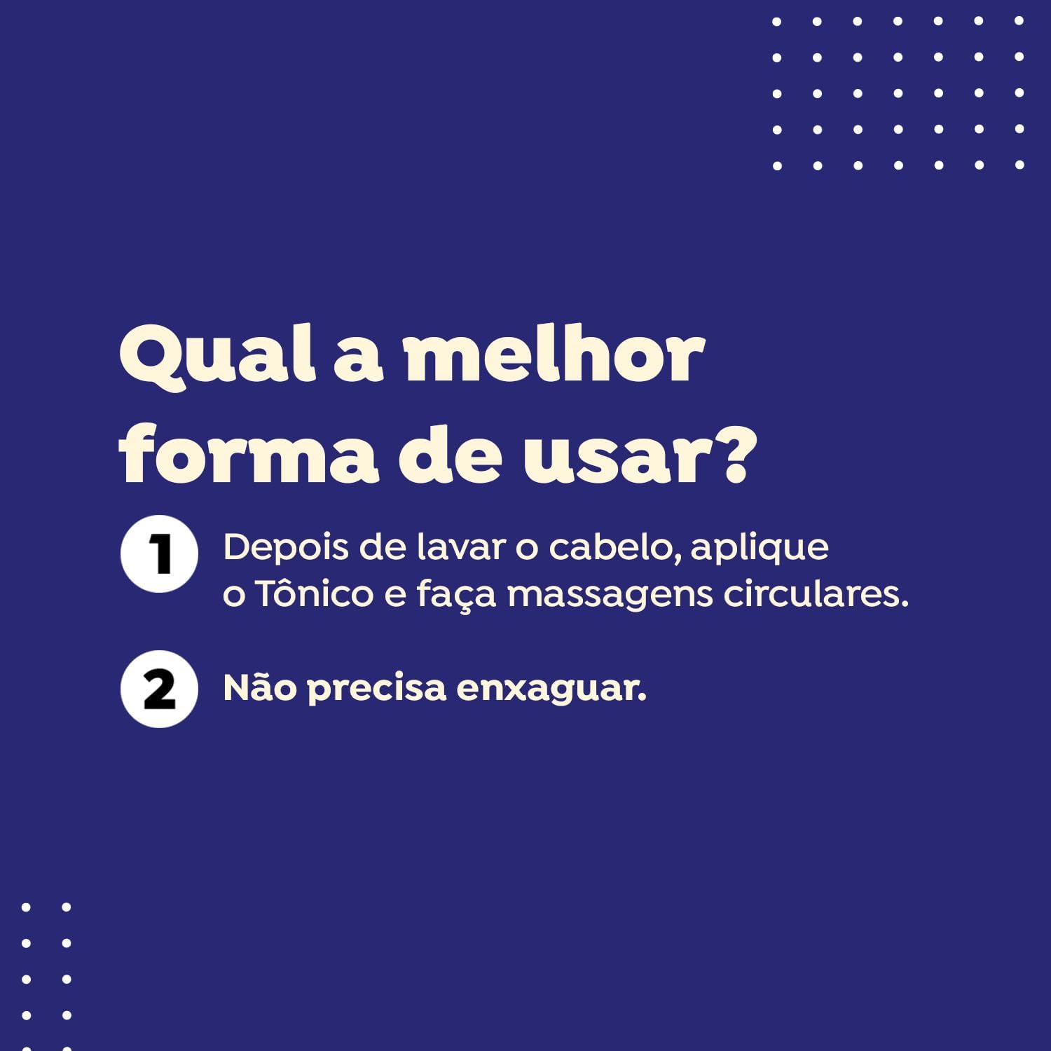 DICA DE USO. Após lavar o cabelo, aplique o tônico capilar e faça massagens circulares, sem precisar de enxágue. Produto vegano, para todos os tipos de cabelo.
