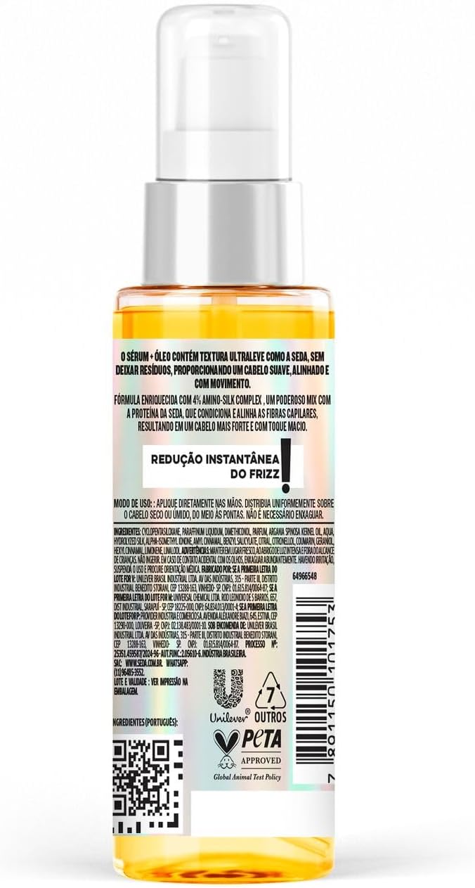 O Sérum + Óleo Toque de Seda possui uma textura ultraleve como a seda, sem deixar resíduos visíveis, proporcionando um cabelo suave, alinhado e com movimento. Sua fórmula é enriquecida com 4% Amino-Silk Complex, um poderoso mix com a proteína da seda, que condiciona e alinha as fibras capilares, resultando em um cabelo mais forte e 6x mais macios. O produto oferece redução instantânea do frizz, restaura a maciez e alinha as pontas, proporcionando nutrição imediata e brilho intenso. Além de oferecer controle imediato do frizz, o Sérum + Óleo possui proteção térmica. Modo de Uso: Aplique diretamente nas mãos e distribua uniformemente sobre o cabelo seco ou úmido, do meio às pontas, sem necessidade de enxágue. O Sérum + Óleo Toque de Seda é ideal para quem busca um aliado no controle do frizz e não abre mão de fios com brilho intenso e movimento. Todos os produtos Toque de Seda são enriquecidos com Amino-Silk Complex, a novidade de Seda para entregar cabelos mais macios por 1 semana. Conheça e experimente a linha completa para resultados ainda mais incríveis e desfrute de um cabelo mais sedoso que desliza como a seda. Com uso da linha completa vs shampoo sem agentes condicionantes