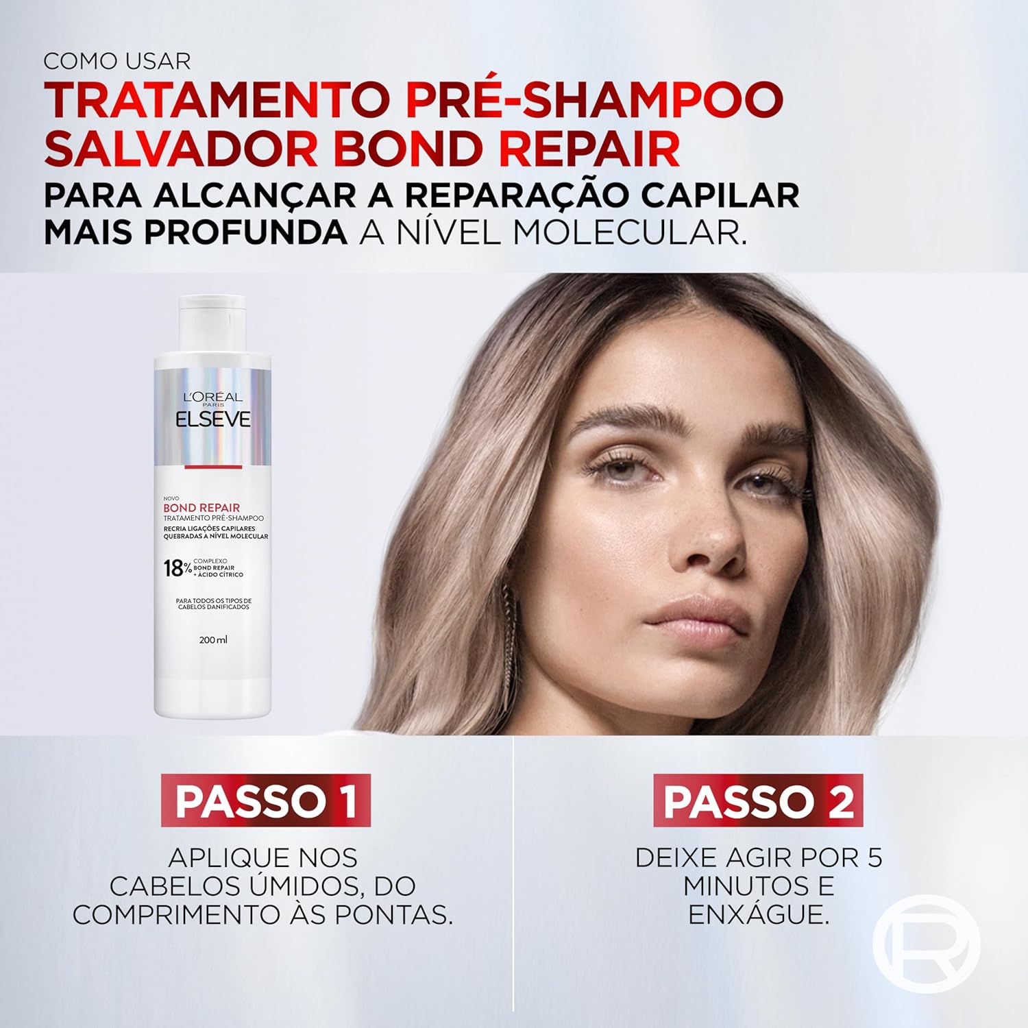 A linha Bond Repair de L’Oréal Paris contém em sua fórmula o Ácido Cítrico que age na camada mais profunda da fibra , o córtex, e recria as ligações capilares quebradas a nível molecular para cabelos transfomados e reparados a sua força original. Use o tratamento intensivo antes do shampoo para alcançar a reparação capilar mais profunda a nível molecular e completar a rotina Bond Repair. *Teste instrumental, após 5 aplicações do sistema pré-shampoo + shampoo + condicionador.